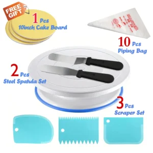11 INCH CAKE TURNTABLE 3PCS CAKE SCRAPER SET 2PCS STAINLESS STEEL SPATULA 10PCS PIPING BAGS 1PCS CAKE BOARD (1)